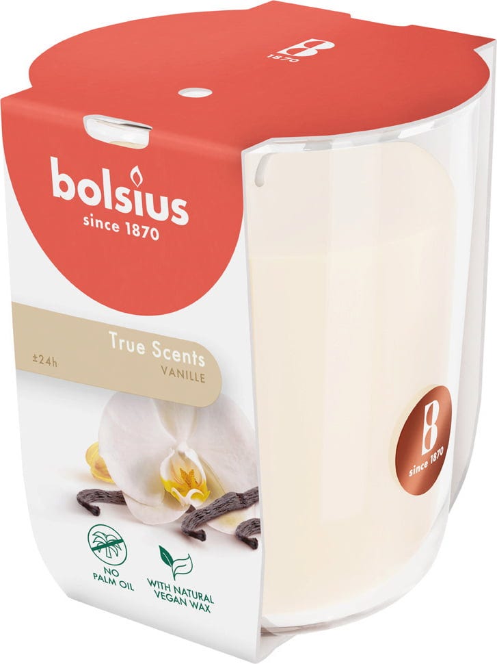 La candela in vetro True Scents di bolsius diffonde il suo profumo per fino a 25 ore e aiuta a neutralizzare gli odori di fumo grazie alla tecnologia Freshplex™. È composta in parte da cera vegetale e priva di olio di palma.