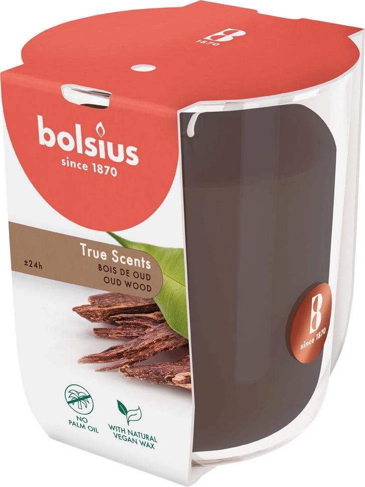 La candela in vetro True Scents di bolsius diffonde il suo profumo per fino a 25 ore e aiuta a neutralizzare gli odori di fumo grazie alla tecnologia Freshplex™. È composta in parte da cera vegetale e priva di olio di palma.