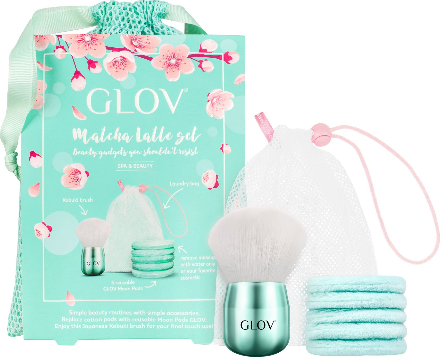 Questo set contiene un soffice pennello Matcha Kabuki ideale per applicare ciprie, blush o fondotinta, una confezione di 5 dischetti riutilizzabili per rimuovere il trucco e un sacchetto lavabile in cui conservare i prodotti.