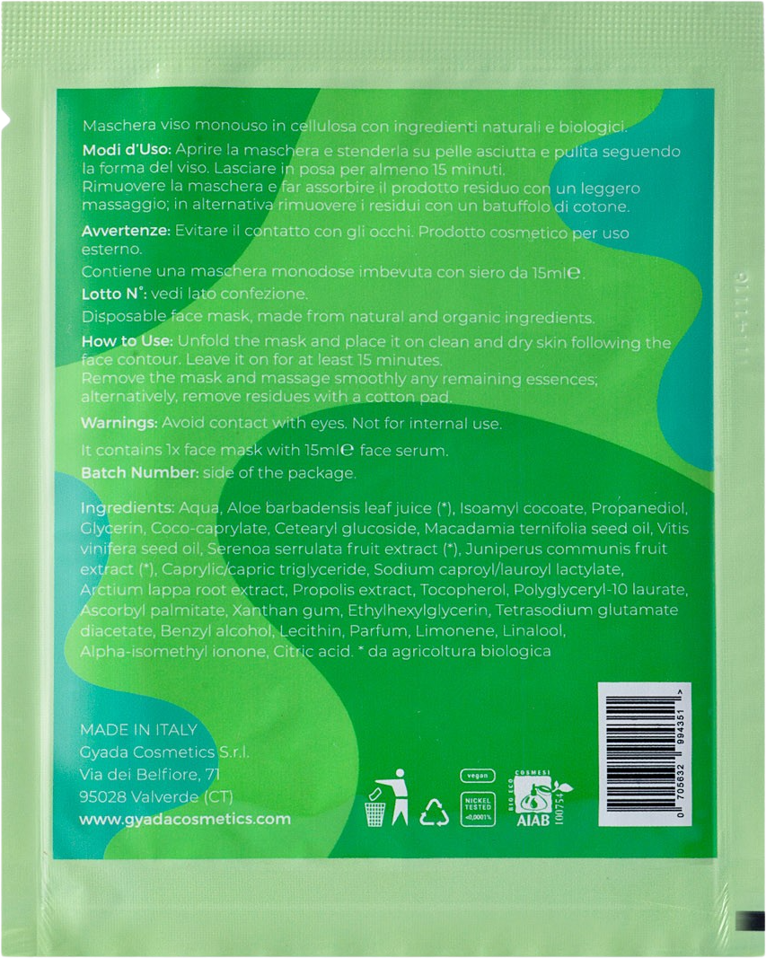 Nota bene! Questo prodotto riporta in etichetta il simbolo vegan, pur contenendo propoli. Come mai? Questo ingrediente è una resina vegetale prodotta dagli alberi e da diverse piante, poi elaborata e trasformata dalle api, che però non la producono direttamente. Di conseguenza, la propoli viene definita a volte un prodotto vegetale e a volte no. GYADA, insieme al laboratorio di produzione, ha descritto questa maschera vegan, partendo dal principio che la propoli non possa essere definita un prodotto di origine animale.