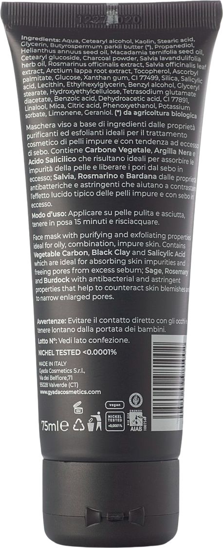 Questa maschera è ideale per pelli impure e grasse. Il carbone attivo, l'argilla nera e l'acido salicilico hanno un effetto schiarente, rimuovono le impurità e liberano i pori dal sebo in eccesso. L'aggiunta di rosmarino, salvia e bardana ha un effetto astringente e opacizzante sulla pelle grassa.