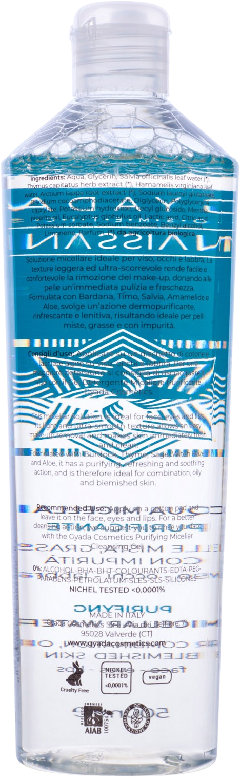 Modo d'uso: applicare su un dischetto di cotone o spugnetta naturale e picchiettare su viso, occhi e labbra. Per una detersione profonda, utilizzare successivamente il gel detergente purificante di Gyada.