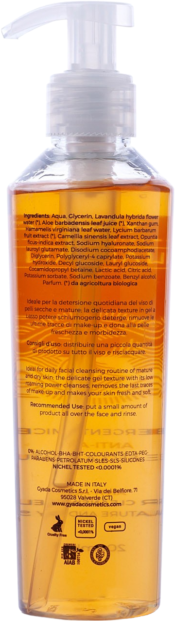 Il gel detergente micellare di Gyada è un cosmetico per la detersione quotidiana della pelle matura e secca. Ideale da usare per eliminare le ultime tracce di acqua micellare, ha una consistenza a basso potere schiumogeno, che rimuove le ultime tracce di make up e dona freschezza e morbidezza.