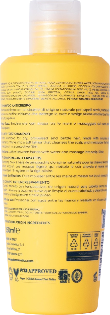Lo shampoo anticrespo Gyada Cosmetics è formulato senza alcool, coloranti o conservanti, parabeni, siliconi o petrolati. È inoltre vegan, cruelty free e nickel tested.