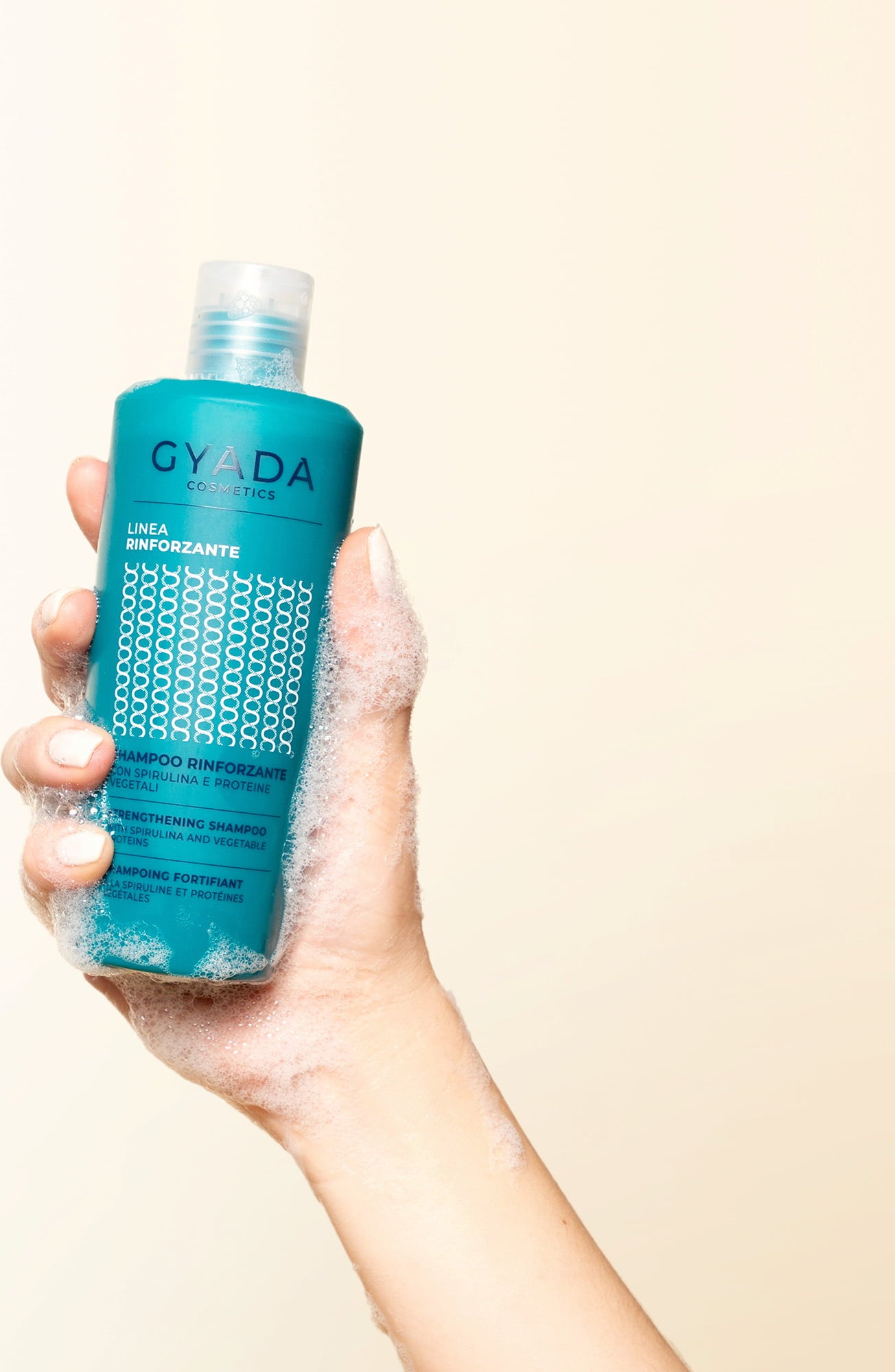 Lo shampoo rinforzante GYADA Cosmetics restituisce vigore ai capelli fragili, stressati e con tendenza al diradamento. È un prodotto concentrato, che ristabilisce l'equilibrio idrolipidico del capello ed è adatto alla detersione di cuti sia secche che grasse.