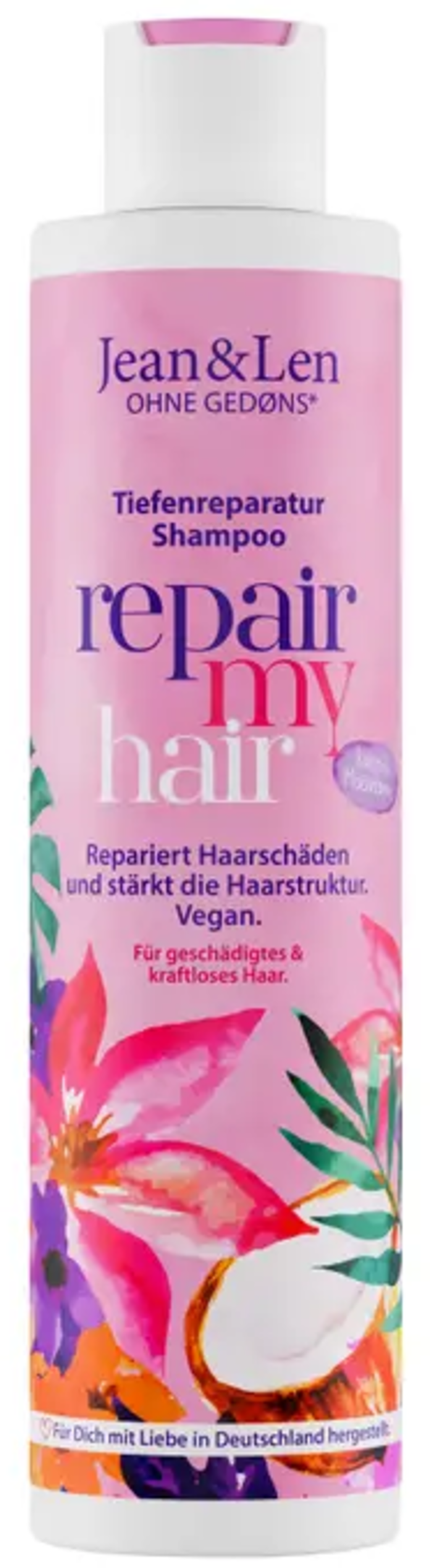 Prenditi cura dei capelli deboli o danneggiati con lo Shampoo Riparatore - Olio di Cocco/Macadamia di Jean&Len. Lo shampoo vegano offre ai tuoi capelli una cura ottimale e li coccola senza siliconi, parabeni, oli minerali e microplastiche.