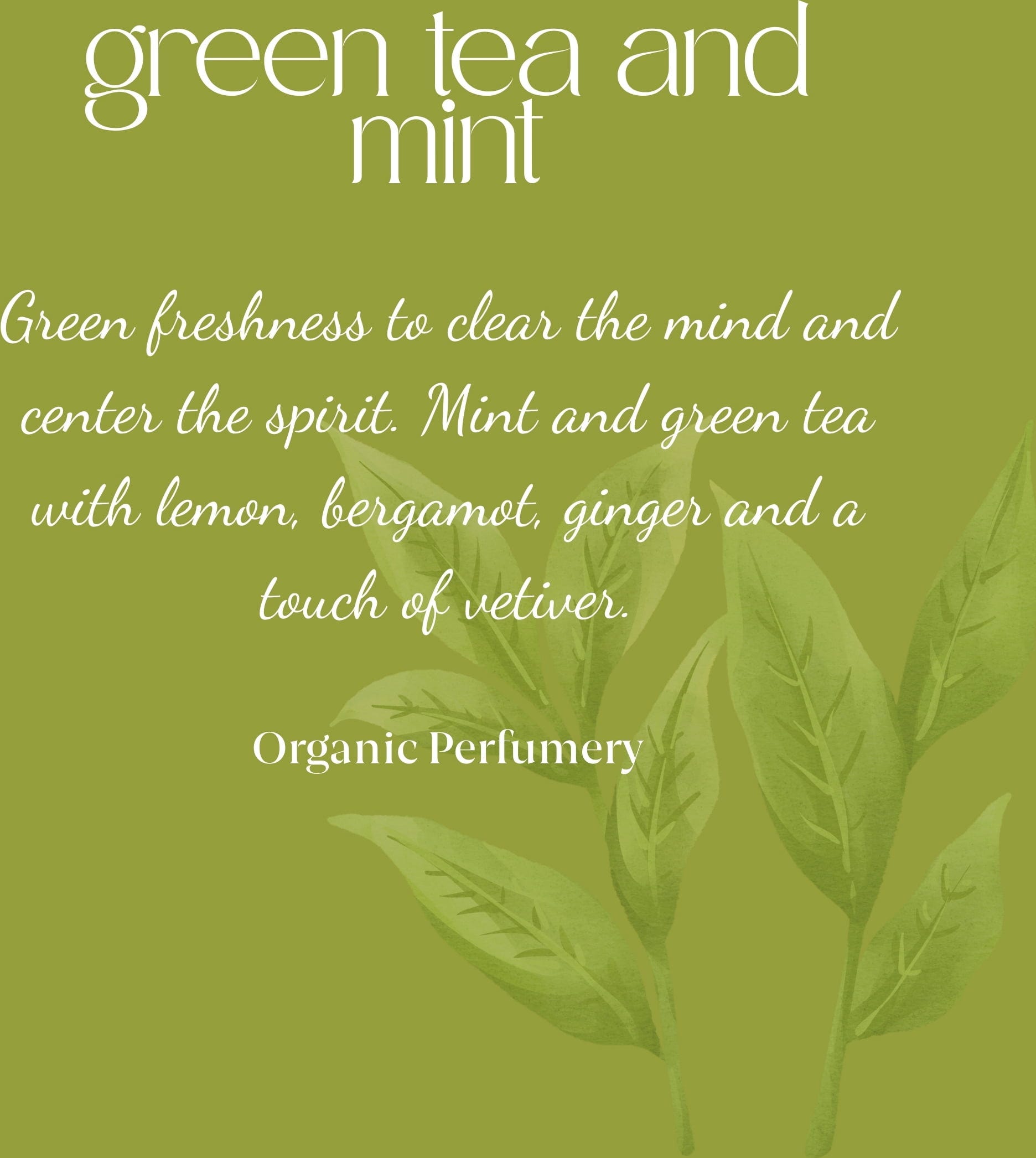 Il profumo rinvigorente di Fragranza fresca biologica al tè e menta ricorda la freschezza del tè verde unita alla menta acidula. È ideale per chi apprezza una fragranza stimolante ed energizzante. Il profumo artigianale è stato macerato con menta biologica, conferendogli una nota ancora più naturale.