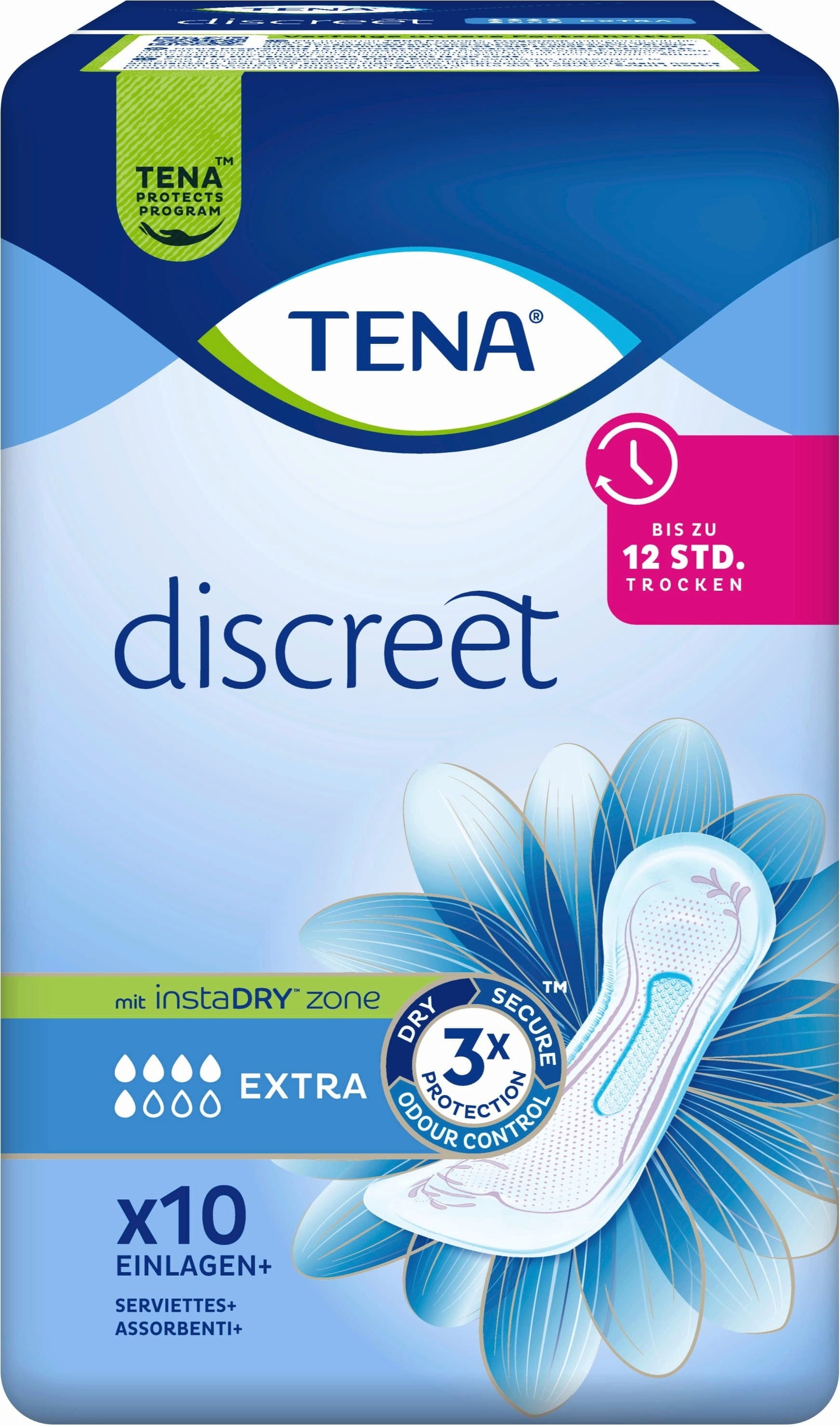 Proteggiti dalle perdite di urina con gli assorbenti Discreet Extra di Tena! L'inserto con tecnologia InstaDRY™ assorbe subito il liquido sulla superficie e offre la massima protezione in caso di perdite moderate. Il sistema Fresh Odor Control utilizza microperle per garantire che il liquido venga intrappolato e immediatamente neutralizzato. Il materiale è privo di profumo e la pratica confezione è perfetta da portare con sé fuori casa.