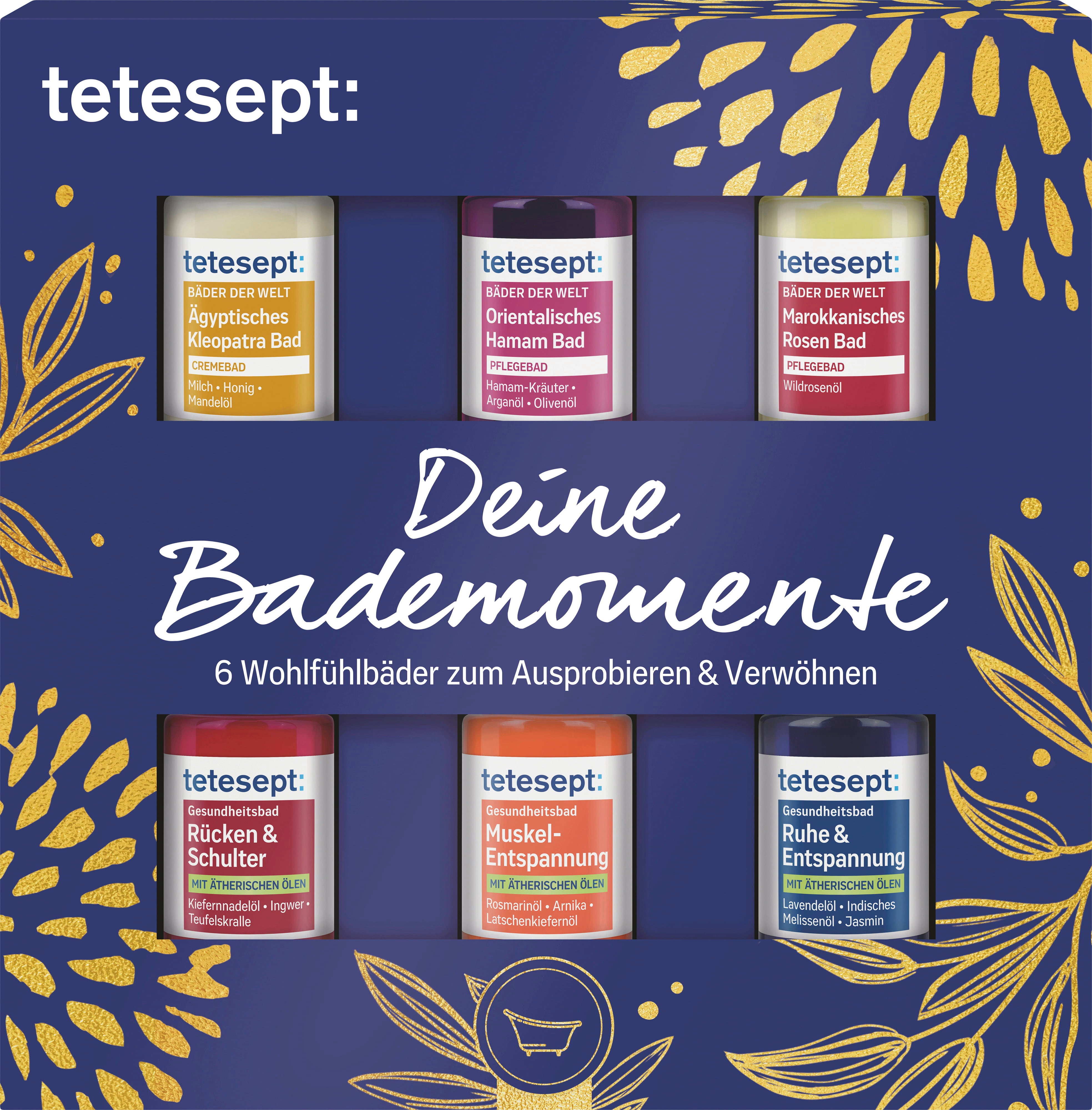 Questo meraviglioso set regalo contiene 6 diversi additivi per il bagno di tetesept, per garantirti momenti di benessere perfetti. Perfetto per te o per i tuoi cari. Ogni additivo da bagno è sufficiente per 2 applicazioni.