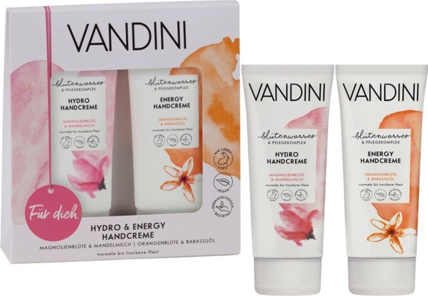 Il set VANDINI, composto da due creme nutrienti per le mani, incanta con i meravigliosi profumi di magnolia e fiori d'arancio, lasciando le mani stressate di nuovo morbide e lisce.