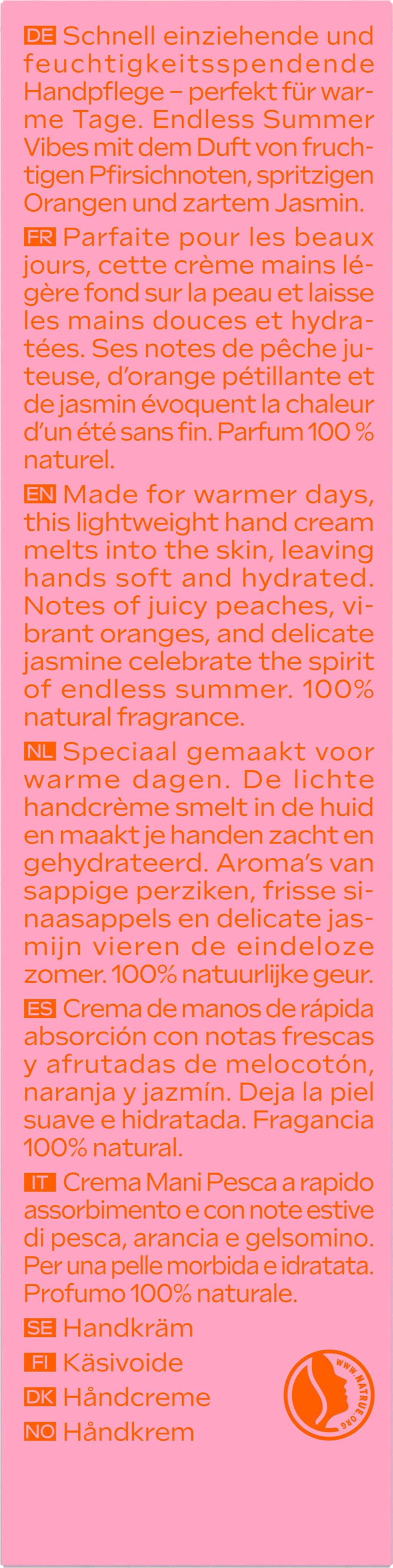 La crema mani Crema mani alla pesca rosa offre un trattamento mani idratante e a rapido assorbimento, perfetto per le giornate calde. La deliziosa fragranza di pesca fruttata, arancia frizzante e gelsomino regala la sensazione estiva per eccellenza. Una crema mani come una calda giornata estiva!